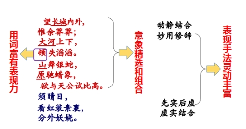 北方大地, 千里冰封冻, 万里雪花飘 。 望长城内外, 只剩下无边无际白茫茫 一 片; 奔腾的黄河上下, 顿时失去了滔滔水势。